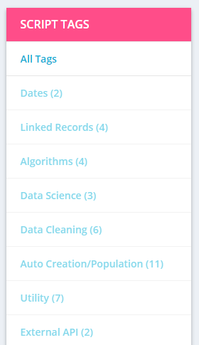 Navigation of the Airtable Scripts Library is simple. Various categories of scripts tags run along the side (on desktop) or top of page (on mobile), and selecting one of the categories instantly brings all related scripts to focus within the viewable list. Simply selecting “All Tags” removes any filters. Upon selecting a script you have access to the creator’s name, the script source, a description, and either the script directly embedded or linked to (in some cases of GitHub).